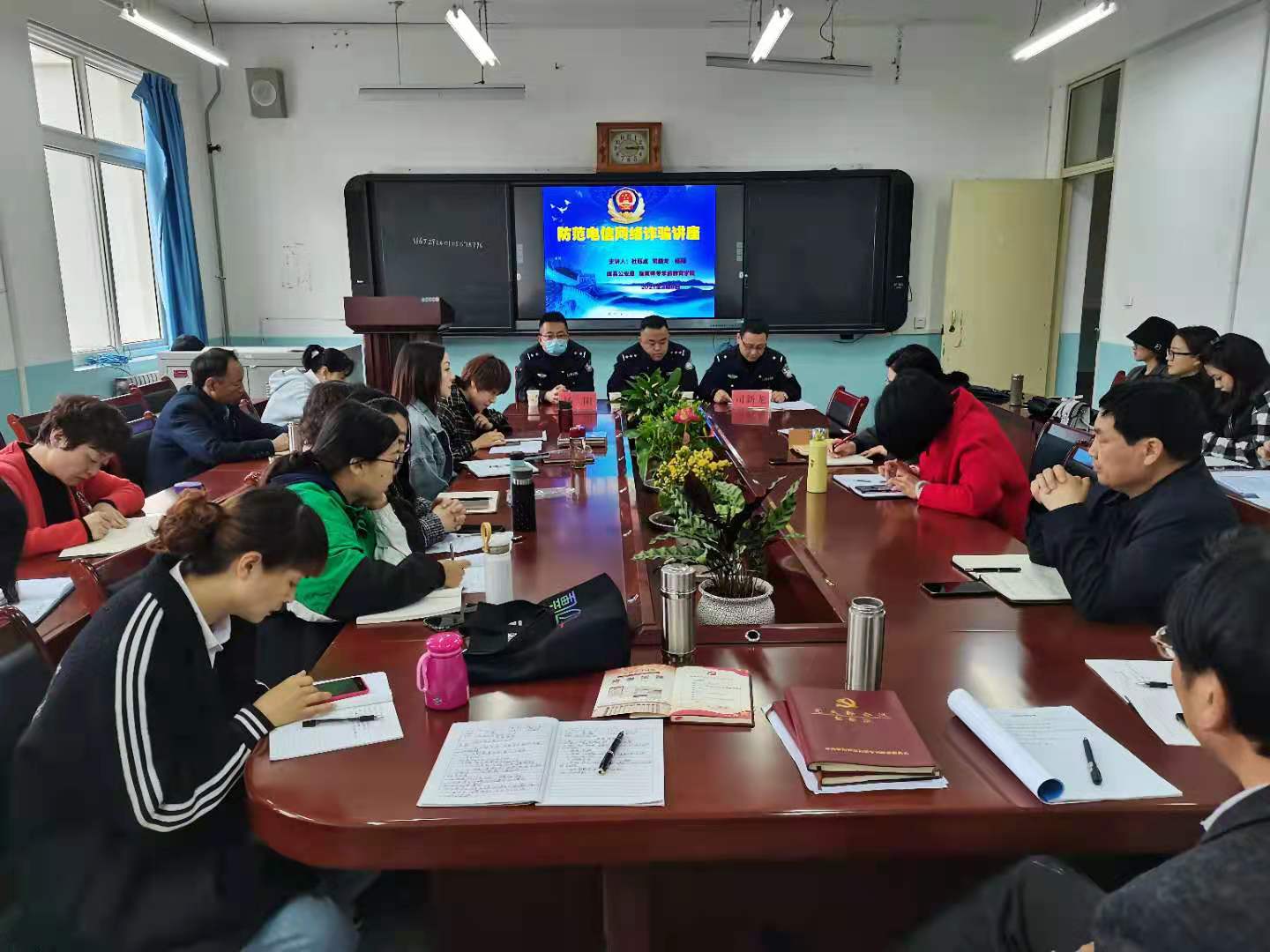月6 日下午三点,sunbet与成县公安局联合举行安全校园建设活动,邀请成县公安局刑警队杜钰成、司新龙、杨阳三位警官给公司师生举行“预防电信诈骗”专题讲座,会议由公司党总支书记李霞主持,全体教师和各班员工代表共同参加。